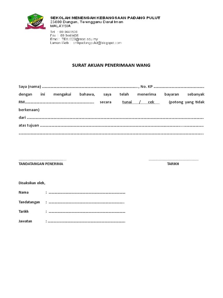 Surat akuan penerimaan wang bayaran surat akuan penerimaan wang bayaran pdf pdf4pro. Program / projek / aktiviti. Contoh surat akuan terima cek sumbangan cute766. 24 lampiran f surat akuan penerimaan wang/bayaran program/projek/aktiviti kepada unit kewangan / bahagian / pejabat bendahari universiti teknologi mara saya . Scanned by camscanner akuan penerimaan bantuan kumpulan wang amanah pelajar miskin bagi tahun perhatian saksi . Surat akuan penerimaan wang tunai. Contoh surat akuan penerimaan bayaran cute766.